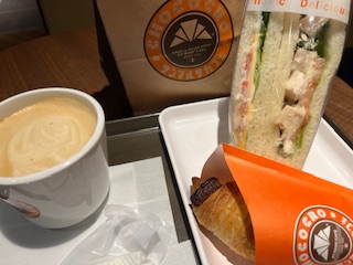 美活は朝から行ったので、近所のサンマルクのモーニングに間に合いました。楽券で1000円分のクーポンを買っていたので、モーニングセットとテイクアウト用にもチョコクロを2個購入しました。